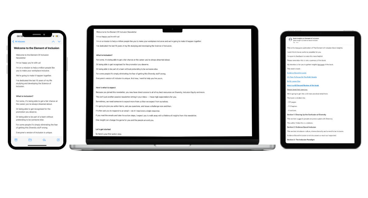 Who is this for?Leaders committed to creating an Inclusive workplace who need inspiration and insights to put into practice.Who is this not for?This is not for people who don't care about Inclusion.This is not for people interested in theory but not practice.Diversity and Inclusion are not part of my day job. Is this meant for me?Absolutely. You’re the person I created this for.Real change is going to come from Everyday Leaders like you.People who care about those around them and are willing to take action.You just don’t want to do it alone.That’s why I created this.Why should I listen to you? Who are you?You do not have to listen to me, but I’ve got a PhD in your problems and I’m on mission to help a million people like you to make your workplace inclusive.I’m the most prolific voice on Evidence Based Inclusion in the world.Ok. You’ve got a PhD. Does that mean this is all theory? I need something practical.Everything I’m sharing is intended to be practical.I’m not trying to get you to pass an exam.I’m here to help you make better decisions in real life at work.What do I actually get?Here’s what you get:Book Breakdowns every two weeksThese are my personal notes and analysis that distill the frameworks and methodologies of relevant DEI books.Experts are charging $4,999 or even $2,999 for less detailed stuff! What's the deal?This isn't my primary source of income and my main goal is to give back to the community.I’m on mission to help a million people like you to make your workplace inclusive.Sharing my best ideas and my tried and tested resources at scale is part of that.What's missing in this that those others charge so much for?You won't find award-winning graphic designs or any photographs of me on stage at corporate events.You won't find pages with stories about my Fortune 500 and FTSE 100 clients instead of delivering the goods.I’m not sitting in some rented luxury office.My writing is simple and to the point.This was created by me in my home office in London simply to give you the insights you need to succeed.Ok. What do I do next if I want to buy?Click the button below and get started today.