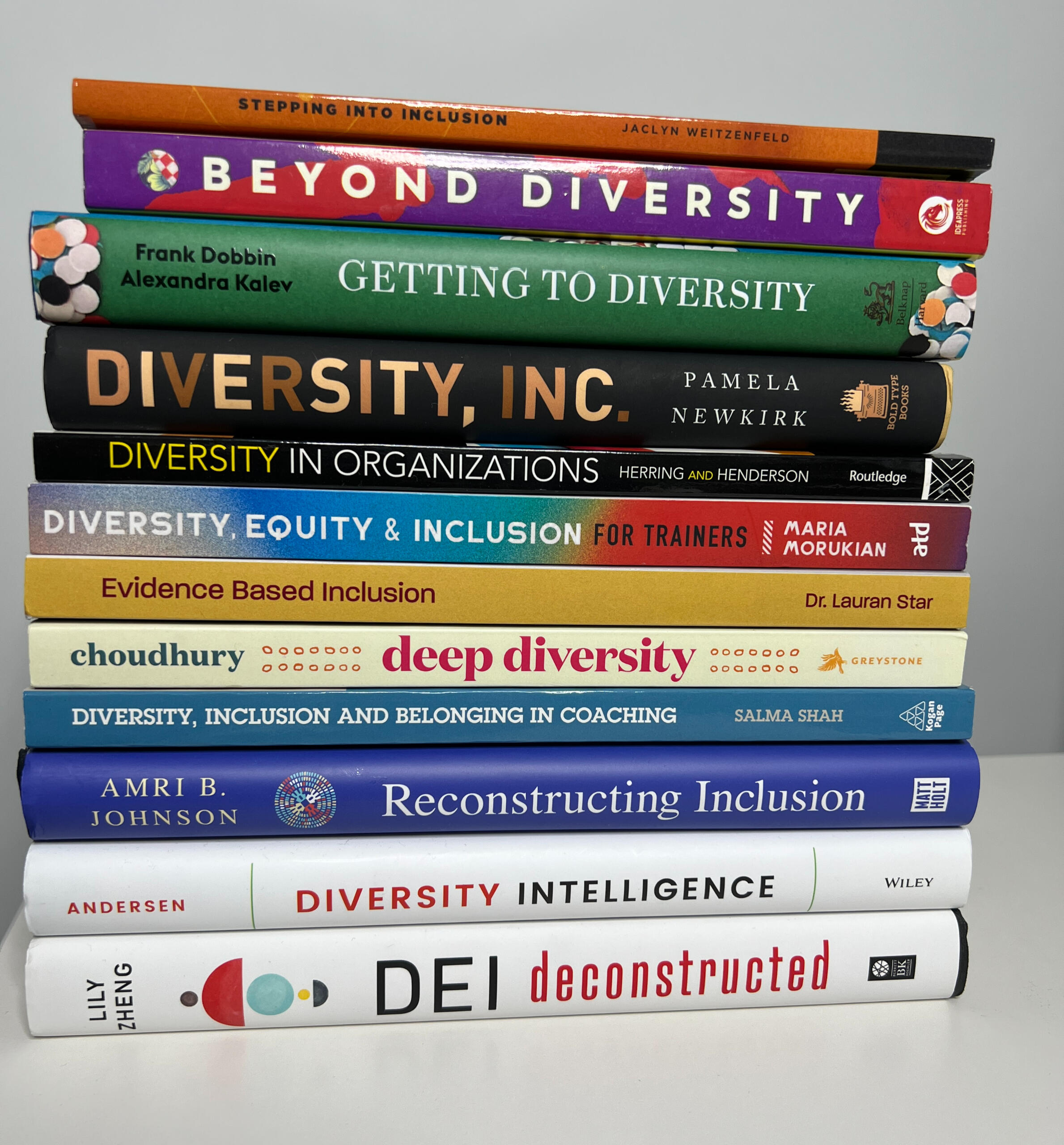 Evidence Based Inclusion By Dr Lauran StarDiversity, Equity & Inclusion For Trainers By Maria MorukianBeyond Diversity By Rohit Bhargava & Jennifer BrownDiversity, Inclusion and Belonging in Coaching By Salma ShahInclusive Leadership By Charlotte Sweeney & Fleur BothwickDiversity in Organizations By Cedric Herring and Loren HendersonAn Everyone Culture By Robert Kegan and Lisa Laskow LaheyInclusalytics By Victoria Mattingly PhD, Sertice Grice and Allison GoldsteinThe Wake Up By Michelle Mijung KimDEI Deconstructed by Lily ZhengUnderstanding Psychological Contracts At Work by Neil Conway and Rob BrinerGetting To Diversity by Frank Dobbin & Alexandra KalevEvidence-Based Management by Eric Barends and Denise M. RousseauBreaking Through by David A. Thomas & John J. GabarroNeurodiversity at Work by Theo Smith and Professor Amanda Kirby
